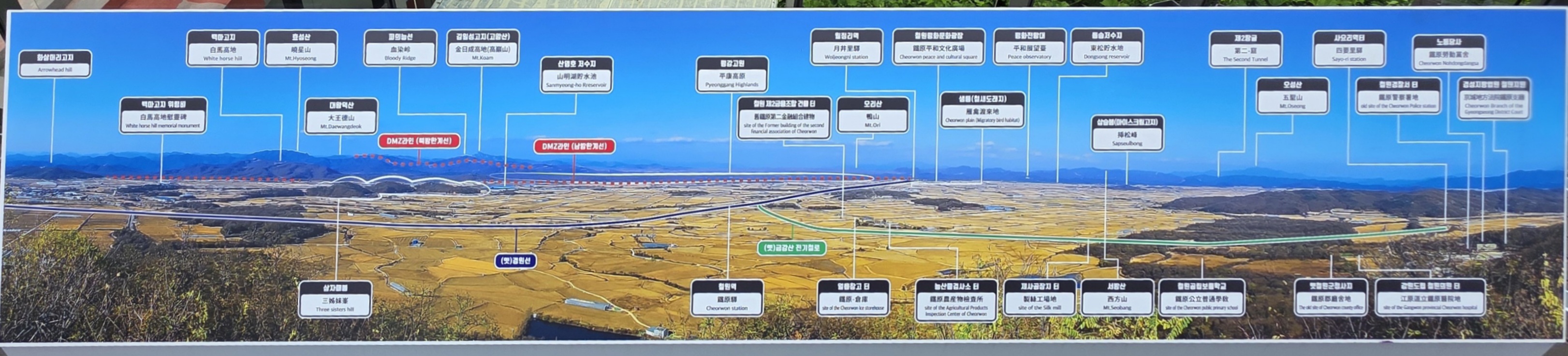 철원평야와 평야 중간중간 한국전쟁 때 치열하게 싸웠을 법한 낮은 산들이 보입니다. 그리고 멀리 북한지역인 듯한 산들도 보입니다. 넓은 평야와 교통의 요충지, 남쪽의 대전과 많이 닮았습니다. 전쟁이후 정체된 지역이되어 버렸지만 이전에는 이곳도 곡창지대로서 잘 사는 곳이었을 것이라는 상상이 됩니다.